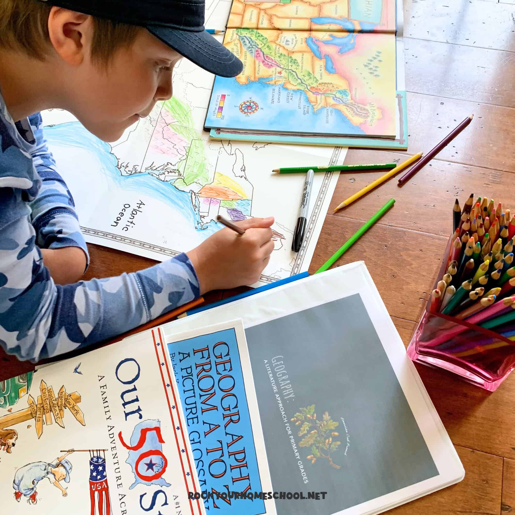 Here’s one of the best homeschool geography curriculum! It’s an active, hands-on curriculum with lessons that include maps, flags, videos, crafts, and coloring pages.