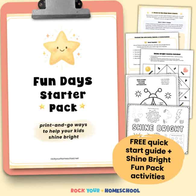 Bring more joy (and less stress!) into your homeschool or classroom with this Fun Days Starter Pack. This free printable pack gives you a hands-on taste of the Fun Pack system with print-and-go activities that help your kids learn, connect, and shine bright through creativity and play.